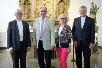 © Kerstin Schmeiser-Weiß (POW) | In der Kapelle des Bischofshauses (von links): Bischof Dr. Franz Jung, Diakon i. R. Reinhold Glaser mit Ehefrau Karolina Glaser und Generalvikar Dr. Jürgen Vorndran