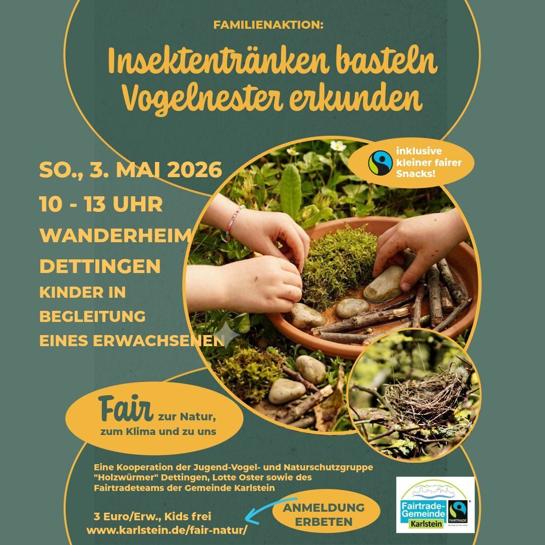 Die Fairtrade-Gemeinde Karlstein lädt gemeinsam mit der Vogel- und Naturschutzgruppe Karlstein sowie Lotte Oster zu einer besonderen Familienaktion ein: Unter dem Motto „Fair zur Natur, zum Klima und zu uns“ erwartet Groß und Klein ein erlebnisreicher Vormittag in der Natur.